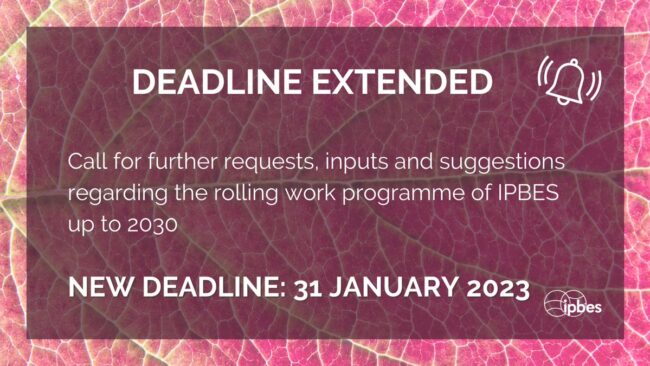 Contribute to shape the IPBES rolling work programme The Intergovernmental Science-Policy Platform on Biodiversity and Ecosystem Services (IPBES) would like to gather requests, inputs and suggestions regarding the rolling work programme of IPBES up to 2030, in time for consideration by the Plenary at its tenth session (2023), and to consider at the same session…