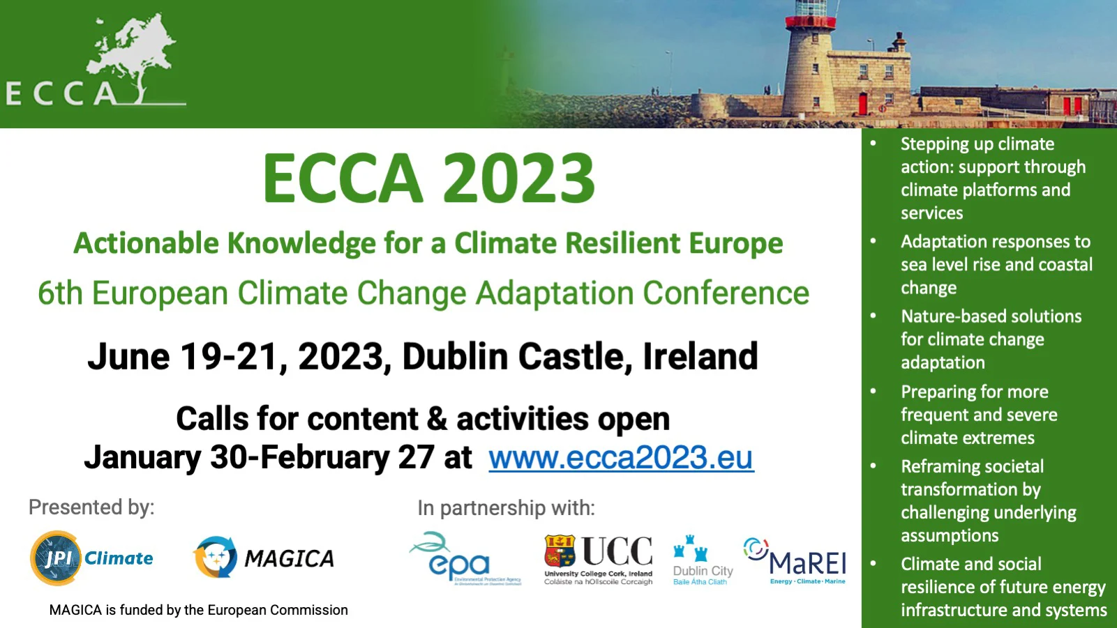 DetailsJoin the 6th European Climate Change Adaptation Conference in Dublin, from 19 to 21 June 2023! At ECCA2023 you will get to discuss, learn and exchange on state of the art ‘Actionable knowledge for a climate resilient Europe’. The organising committee has opened a call to help co-designing the programme of the conference. Apply by…